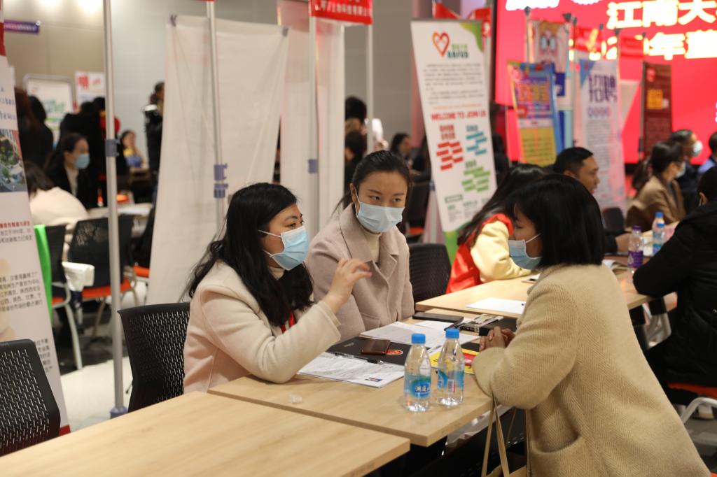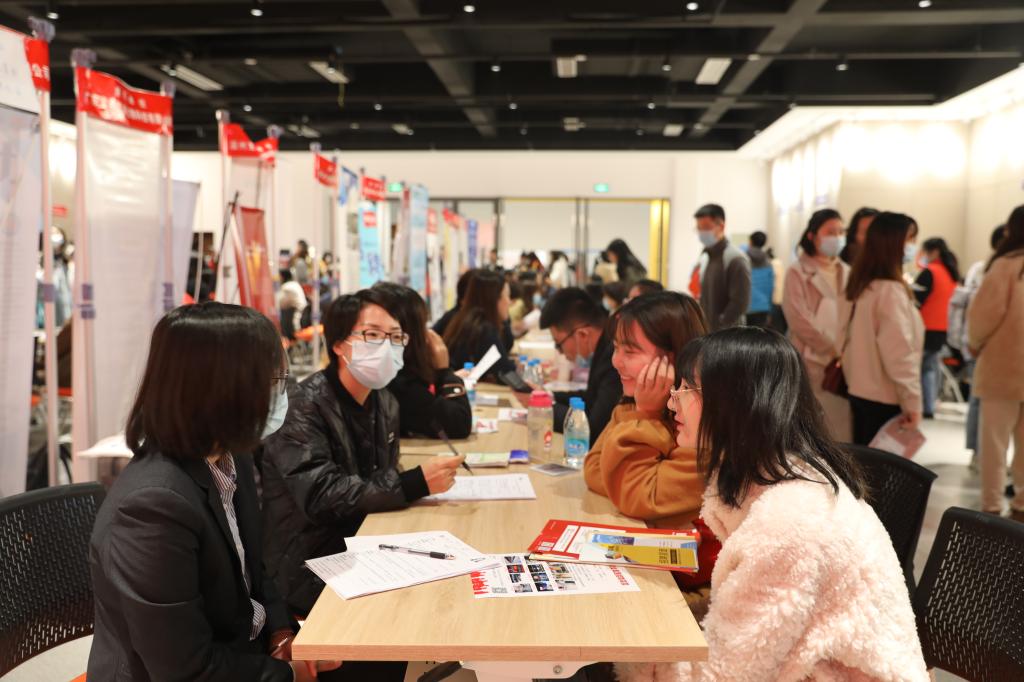 招聘会现场,各企业通过海报、单页等形式进行宣传,同学们在志愿者的引导下走到各企业的展位前,递交简历,并进行现场面试。在企业工作人员的讲解下,同学们了解到了心仪企业的发展方向、岗位需求、招聘人才要求等信息。除毕业生外,其他年级的学生也来到现场感受求职氛围,提前了解就业形势,现场气氛十分活跃。