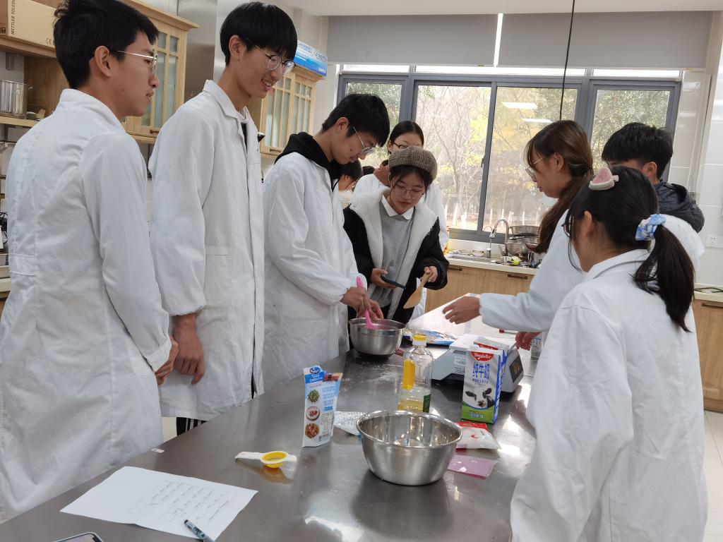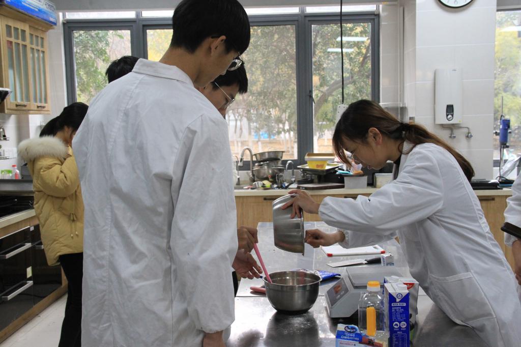 活动开始,同学们按照要求穿好实验服、清洁双手,根据烘焙科学俱乐部负责同学的指示进行操作。大家一起准备好原料,按照各个步骤制作蔓越莓小球。烘焙俱乐部的同学在操作过程中不断提醒大家注意事项和细节处理,指导同学们做出满意的产品。在等待蔓越莓小球烘烤的时间里,烘焙科学俱乐部的成员还为新生们展示了之前做过的产品,耐心介绍了工坊里的原料库和包装库,让同学们对学院的俱乐部有了进一步认识,也在寒冬中感受到了来自学生社团的热情与温暖。最后,同学们亲手制作的蔓越莓小球出炉,大家围在一起,欣喜品尝亲手制做的美食。