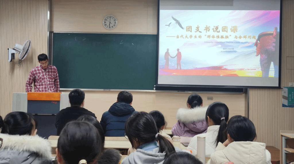 近日,食科2004班在二教2B401召开第一次团支书说团课活动——“当代大学生群体性孤独与合群问题”。班主任杨震、辅导员刘鑫、学生副班主任陈韵洁、食科1904团支书周戚薇以及食科2004班全体同学参加了活动。