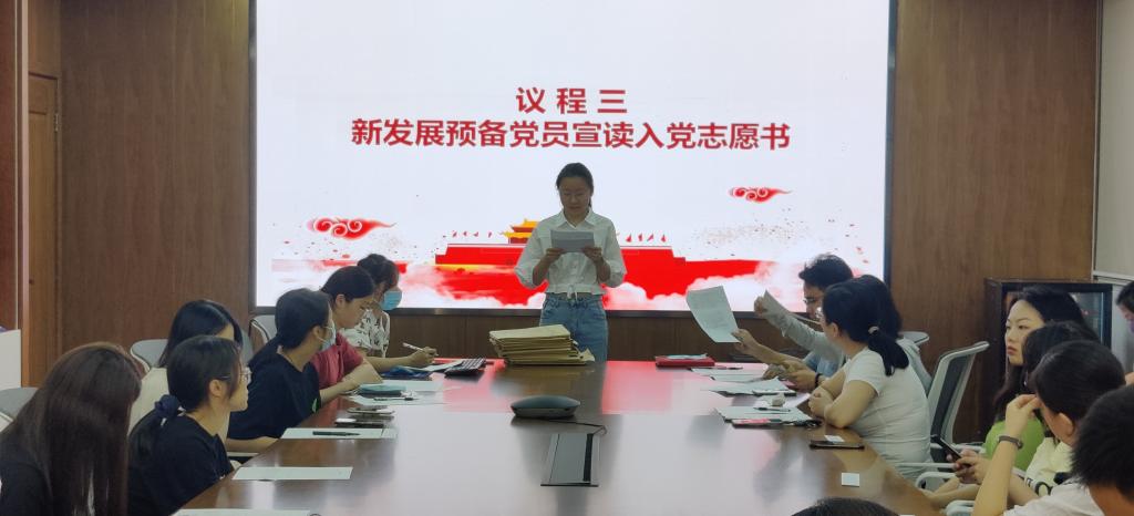 大会在庄严的国歌声中拉开序幕。首先由支部书记杨光宝同志代表支委会宣读关于刘芷阁、倪思祺、唐荷婧、唐性杨、丁玉婕、叶子乐、赵利、杜婷、刘陈钰9名同志作为入党发展对象的支部意见。上述同志依次宣读《入党志愿书》,并陈述在被列为考察对象以后学习、生活、思想等方面的发展状况。杨光宝、胡卉君、王文燕等同志作为入党介绍人分别就9名同志的培养及考察情况向大会作介绍。与会党员进行了广泛而细致的讨论。经会议表决,大家一致同意刘芷阁等9名同志成为中共预备党员。