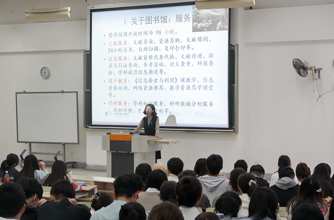 严而清从学校图书馆简介、文献资源与服务、《信息检索与利用》课程、中外文数据库的检索利用、学科服务平台、检索系统追踪和检索学科资源的方法和技巧等方面,对“如何利用图书馆数字资源与服务”进行了全面讲解。她还结合食品学科背景,对新生使用图书馆数字资源的热点问题进行了深入浅出的阐述和解答。