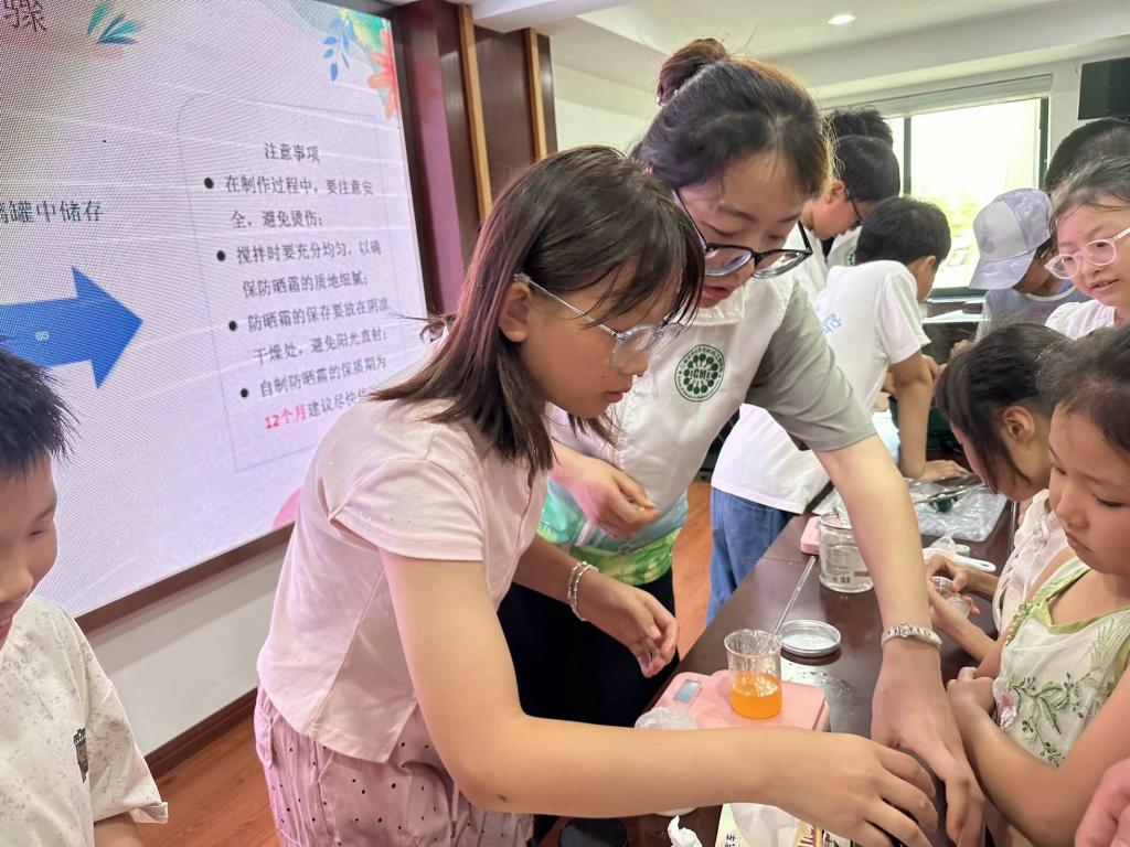夏日炎炎,长时间暴露在烈日下容易引发皮肤问题。此行,化工学院实践团秉持“绿色化学、健康化学、环保化学”的理念,走进兴化市新阳社区,为小朋友们带来“阳光下的守护者”科普实践课程。活动过程中,实践团成员引导小朋友们了解关于皮肤和防晒的小知识,并带领大家通过原料称量、加入混合、封入包装、静置冷却等步骤,亲手制作防晒霜,沉浸式体验“美丽化学”的独特魅力,传递健康中国、美丽中国生活理念。