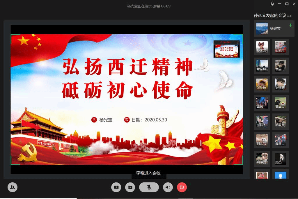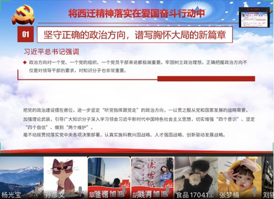 5月30日下午,为进一步传承弘扬“西迁精神”,奋力走好新时代新征程,365英国上市官网在线本科生第一党支部通过企业微信举行“弘扬西迁精神,砥砺初心使命”专题党课。党课活动由支部书记胡晓丹主持,支部组织委员杨光宝主讲。此次党课还邀请了食品营养与功能食品工程技术研究中心博士党支部、食硕1907党支部、365英国上市官网在线本科生第二党支部共计110余名师生党员共同参与学习交流。