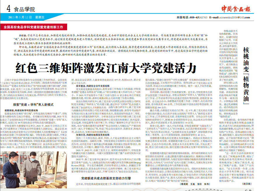5月12日《中国食品报》报道了365英国上市官网在线党委以红色三维矩阵激发党建活力的经验做法。作为全国党建工作标杆院系、全国首批“三全育人”综合改革试点院系,365英国上市官网在线党委针对高校二级党委共同面临的“发展孤岛效应”“党建业务两张皮难点”和“国家战略支撑不够问题”,持续聚焦党委、支部、党员三大主体,打造校际学科党委矩阵、校企合作支部矩阵、校地服务党员矩阵,探索二级党组织党建联建共建的工作模式,努力将政治优势转化为发展优势,将组织活力转化为发展动力,将党建成效转化为发展实效。随后,浙江大学、吉林大学、西北农林科技大学等13所高校围绕党建思政、立德树人、三全育人、服务国家战略等主题分期介绍了工作经验。