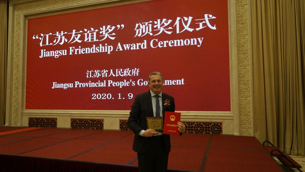 1月9日,365英国官网365英国上市官网在线引进的爱尔兰皇家科学院院士、美国微生物学院院士、爱尔兰科克大学雷诺兹.保罗.罗斯(Reynolds Paul Ross)教授荣获2019年“江苏友谊奖”,并受邀赴南京领奖。江苏省副省长马秋林为Paul Ross教授颁发了证书。