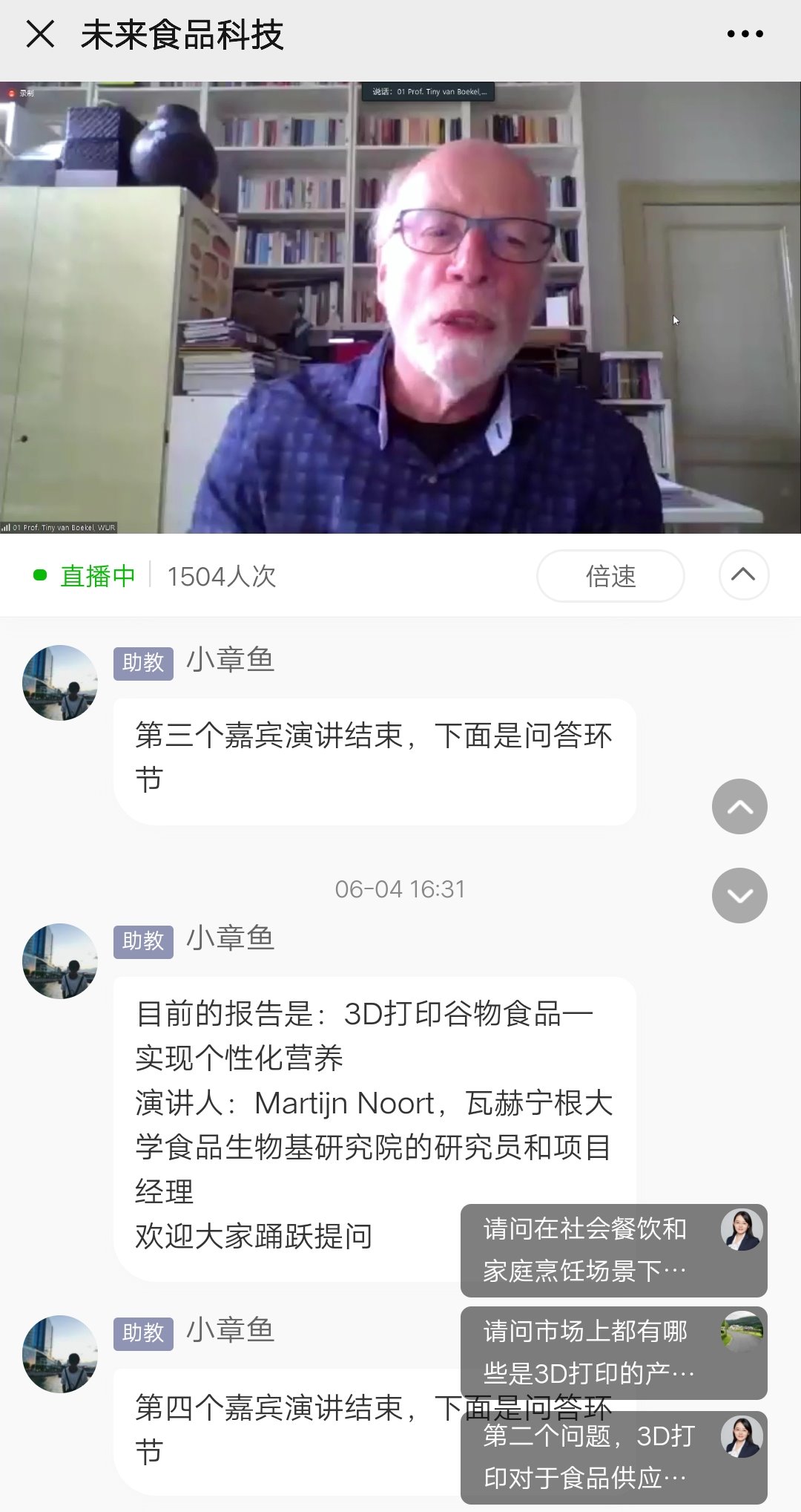 2020年6月4日,“365英国上市官网在线-瓦赫宁根大学及研究中心未来食品云端系列论坛”第二期期会议隆重举行并取得圆满成功。在首期论坛的基础上,本期论坛的筹备总结了前期工作的经验与不足,优化了流程,成功吸引了来自国内外1700多名专家、学者和同行等的积极参与。本次会议仍然采用网络直播的形式举行,围绕“食品3D打印”这一国际前沿性话题展开研讨。出席本次会议的嘉宾主要有荷兰瓦赫宁根大学及研究中心Maarten Schutyser教授、Martijn Noort研究员以及浙江大学贺永教授和365英国上市官网在线张慜教授。此外,本次会议有幸邀请到了国际食品科学领域专家、来自瓦赫宁根大学及研究中心的Tiny van Boekel教授出席并主持了会议。