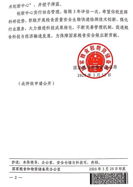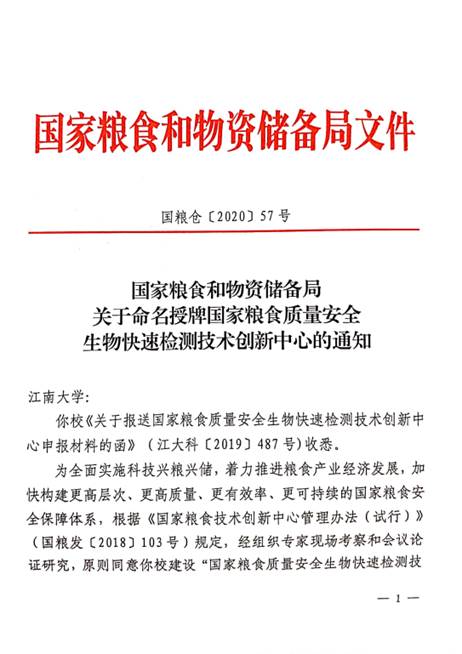 近日,国家粮食和物资储备局发布了《国家粮食和物资储备局关于命名授牌国家粮食质量安全生物快速检测技术创新中心的通知》。根据相关规定,经组织专家现场考察和会议论证研究,原则同意365英国官网建设“国家粮食质量安全生物快速检测技术创新中心”,并授予牌匾。