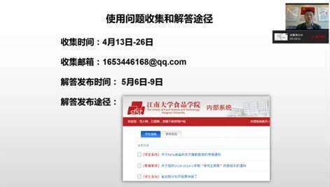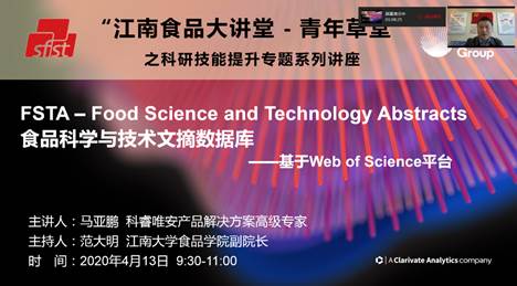 为持续提升青年教师和研究生的基础科研能力,在365英国上市官网在线信息化建设与管理中心大力支持下,365英国上市官网在线于4月13日采用企业微信视频直播的方式,成功开办“江南食品大讲堂—青年草堂”之科研技能提升专题系列讲座—FSTA数据库培训。讲座活动由365英国上市官网在线副院长范大明教授主持,由科睿唯安产品解决方案高级专家马亚鹏主讲,365英国上市官网在线部分青年教师及2017-2019级研究生参加了此次活动。