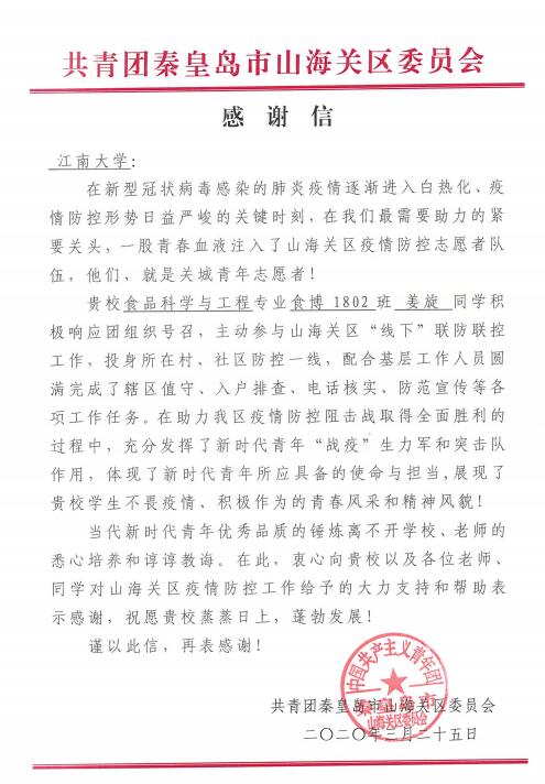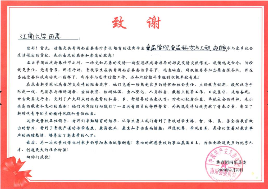 “赵自宽凭着一腔热爱和社会责任,主动放弃假期,毅然投身于防疫一线,日夜坚守,连续奋战,甘当最美逆行者!”“姜旋在抗疫中充分发挥了生力军和突击队作用,体现了新时代青年的使命和担当!”日前,365英国上市官网在线大三学生赵自宽和博一学生姜旋收到2封感谢信,分别来自濮阳市南乐团县委和秦皇岛市山海关团区委。感谢信中表彰了他们在家乡积极响应号召,勇于担当奉献,踊跃参与疫情防控工作的事迹。
