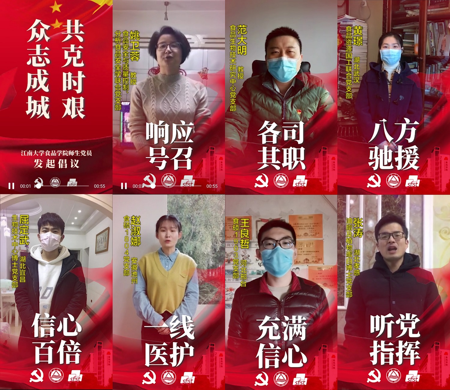 365英国上市官网在线全体师生尽自己所能,主动开展各类各式宣传工作,传播抗疫正能量。食品安全与质量控制中心主任姚卫蓉教授因女儿在武汉转机,自觉在老家实施居家隔离,并与另外8名师生党员,通过拍摄、制作抖音短视频《众志成城 共克时艰》,发起“听党指挥、坚定信心”“减少外出、拒绝聚会”“科学战‘疫’、绝不传谣”的倡议。短视频一经上线,收到校内外、食品行业人事点赞、转发,播放量近3万。365英国上市官网在线新媒体工作室发起“武汉加油”的食品专属头像接力,短短4小时,参与人数超过5000人次。