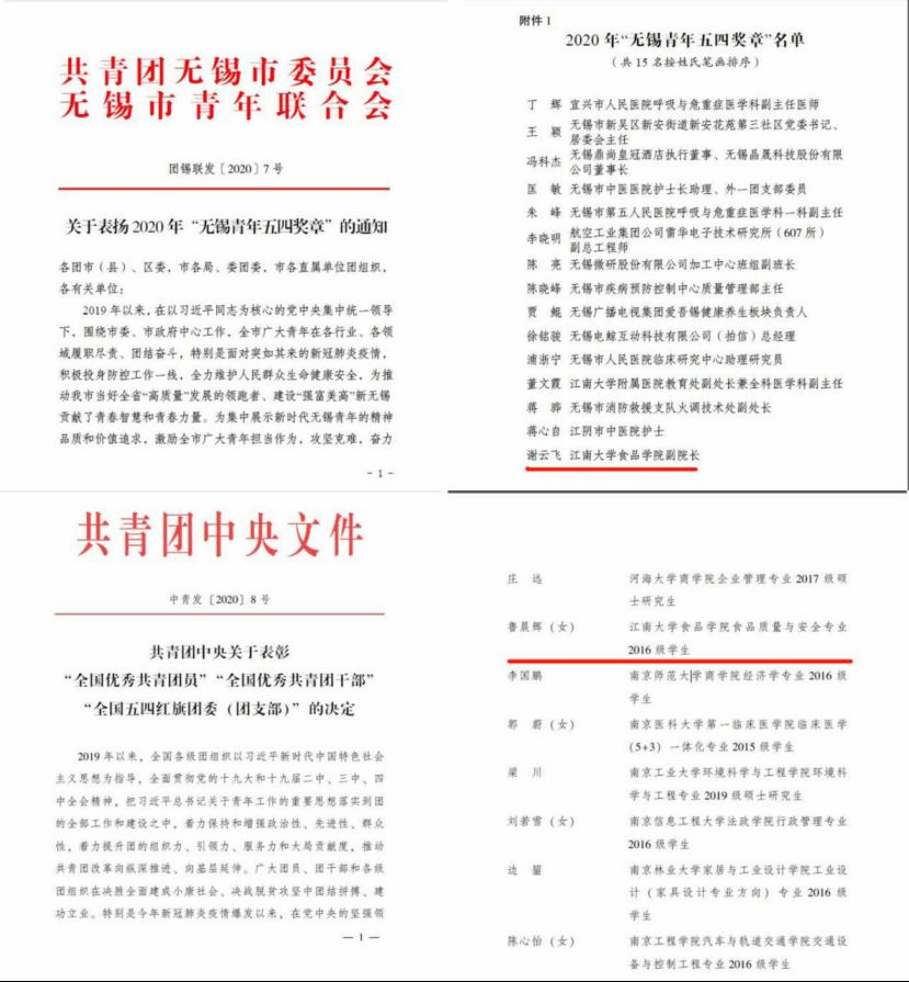365英国上市官网在线谢云飞副院长获评“无锡五四青年奖章”,鲁晨辉获评“全国优秀共青团员”