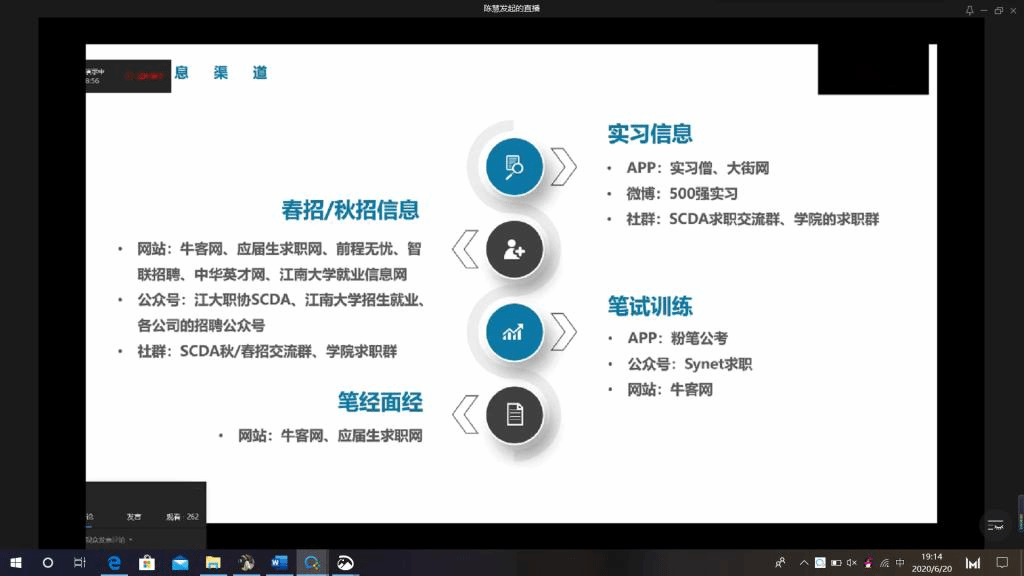为不断强化2021届毕业年级同学就业创业信心,做好疫情防控形势下的就业帮扶工作,6月20日晚,365英国上市官网在线举办“身边的榜样,前行的力量”2020届优秀毕业生分享会之就业创业专题活动,邀请陈慧、杨志杰、王栎雯三位毕业生分享自己的成功就业经验,270余名同学积极报名参加此次活动。