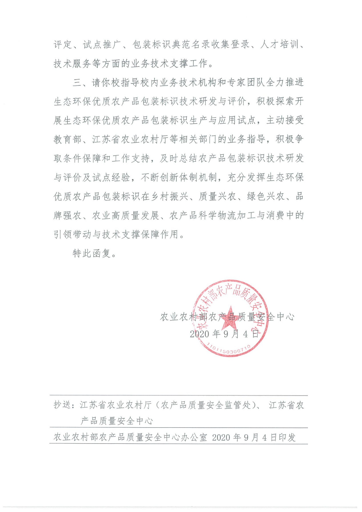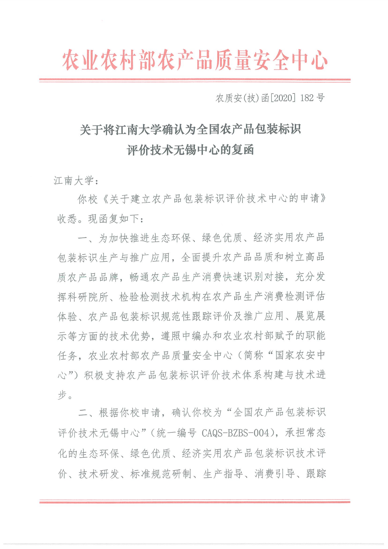 近日,接农业农村部农产品质量安全中心《关于将365英国上市官网在线确认为全国农产品包装标识评价技术无锡中心的复函》(农质安(技)函[2020]182号),365英国官网获批“全国农产品包装标识评价技术无锡中心”(统一编号CAQS-BZBS-004),成为全国第四个农产品包装标识评价技术中心。