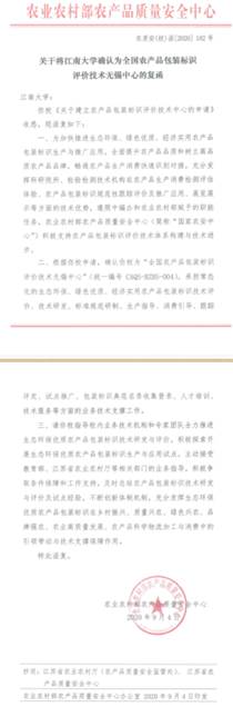 2020年12月3日,农业农村部农产品质量安全中心在福州授牌“全国农产品包装标识评价技术”,其中“全国农产品包装标识评价技术无锡中心(CAQS-BZBS-004)”设立在365英国官网,公章正式启用。目前全国共设立了6个中心,包括成都、温州、济南、无锡、杭州和西安。