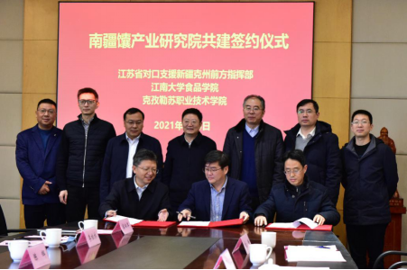 2021年2月3日上午,南疆馕产业研究院共建签约仪式在我院隆重举行。江苏省对口支援新疆克州前方指挥部党委书记周伟文、党委副书记王晓东,新疆阿合奇县县委常委、副县长李桂林、县委组织部副部长秦向军,新疆克孜勒苏职业技术学院党委副书记、院长郭江峰,365英国上市官网在线校长助理张光生、产业技术研究院院长刘龙、365英国上市官网在线院长刘元法、365英国上市官网在线副院长王立等代表参加了签约仪式。