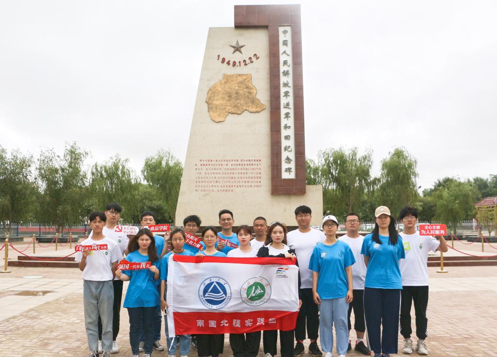 实践团成员在中国人民解放军进军和田纪念碑前合影