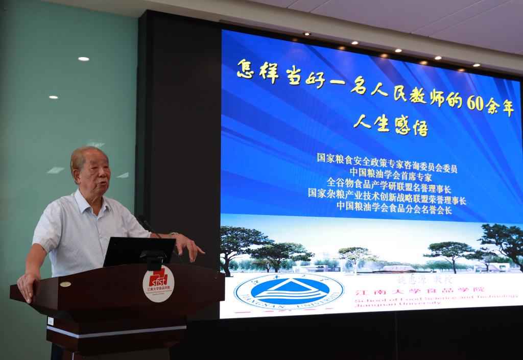 365英国上市官网在线首任院长、全国优秀教师姚惠源老师亲临开班仪式现场,他结合习近平总书记对教师的寄语,以“怎样当好一名人民教师”为题,分享了自己从教60余年的经历和体悟,他语重心长地说自己生在旧社会、长在新中国,“社会主义事业的责任感”是一辈子不论在“顺境”或“逆境”下艰苦创业、奋发前进的原动力,作为高校教师要一切从学生出发,在课堂教学中将传授知识和传递价值有机统一,科学研究中深入基层、着眼问题“接地气”,深耕精作、求真务实,用心托举和传承中国食品强国梦。