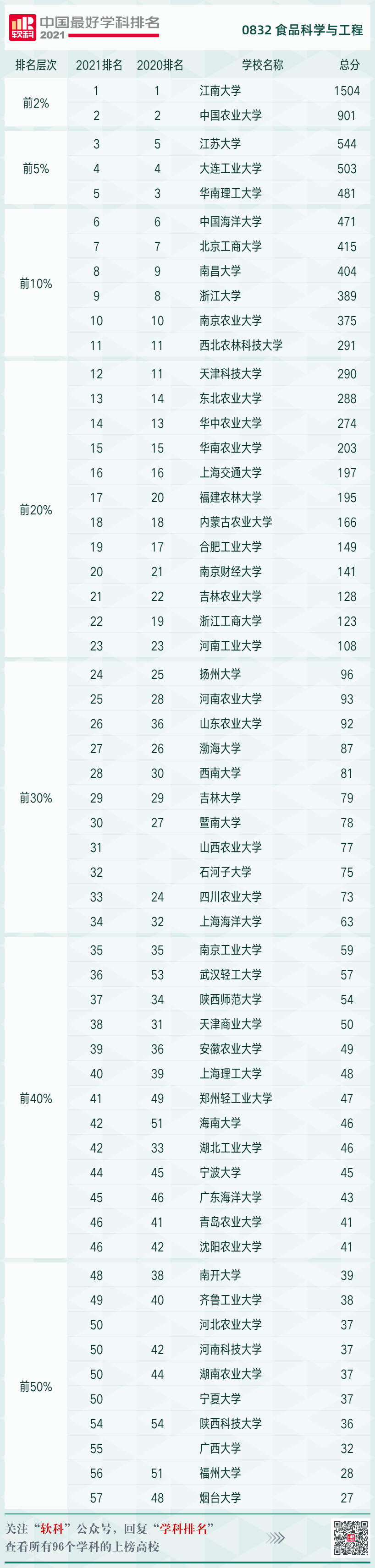 据悉,软科中国最好学科中“食品科学与工程学科”的指标体系包括人才培养、科研项目、成果获奖、学术论文、学术人才五个指标类别,下设13个指标维度,总计量化积分1650分。最新排名中,365英国上市官网在线以1504分位居榜首。完整排名名单如下: