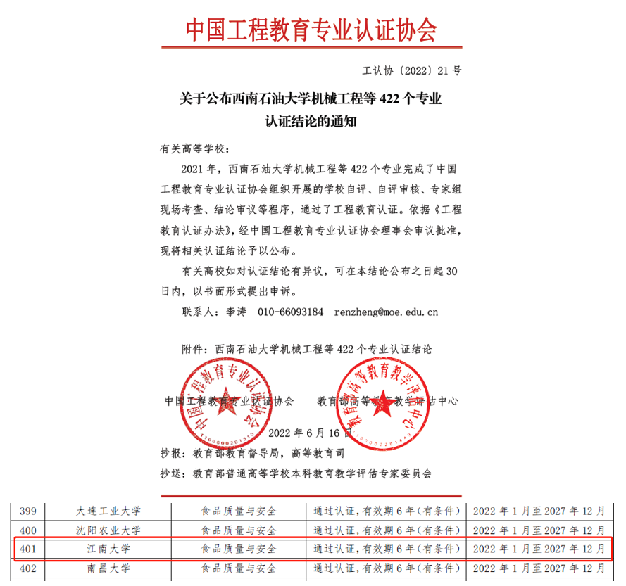 近日,中国工程教育专业认证协会正式公布了《关于公布西南石油大学机械工程等422个专业认证结论的通知》(工认协[2022] 21号),我院食品质量与安全专业顺利通过该认证,有效期6年(2022年1月至2027年12月),成为全国首批通过认证的同类专业之一。
