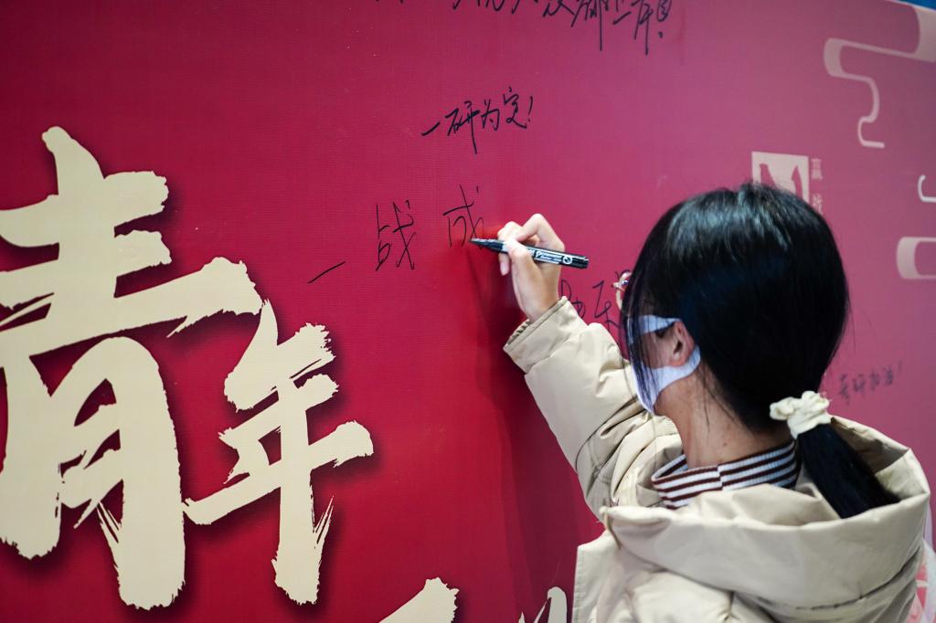 同学们驻足大屏幕前认真观看自命题试卷拆封教程视频,学习考试有关技巧,在“食代青年,一‘研’为定”签名墙上写下美好心愿,并手持加油牌与老师们合影留念。