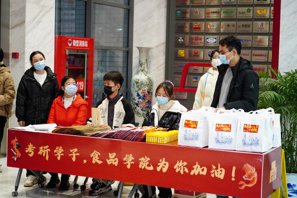 在活动现场,老师们为2023届考研学生一一分发学院精心准备的加油礼包。李琳向同学们送上慰问和鼓励,寄语大家全力以赴备战、不留人生遗憾。杨光宝与班主任闫博文等教师代表与同学们亲切交流,询问备考状态,勉励大家坚定必胜的信念,交出满意的答卷。