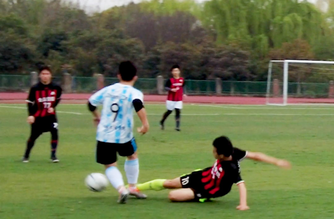 随着主裁判赵来安老师的一声哨响,本届决赛正式开始。由身穿蓝白间条衫的机械学子率先开球,食品学子则身着红黑间条衫球衣。双方在开局简单试探后,便拉开架势展开对攻。机械学子的远距离任意球颇具威胁,两名队员战术配合,突施冷箭一脚打门,稍稍偏出。食品学子也迅速做出了回应,周昊旻开出的任意球传到后点,队长孙希昊迅速包抄,可惜差之毫厘,未碰到皮球。双方在你来我往却均无建树,上半场0:0。