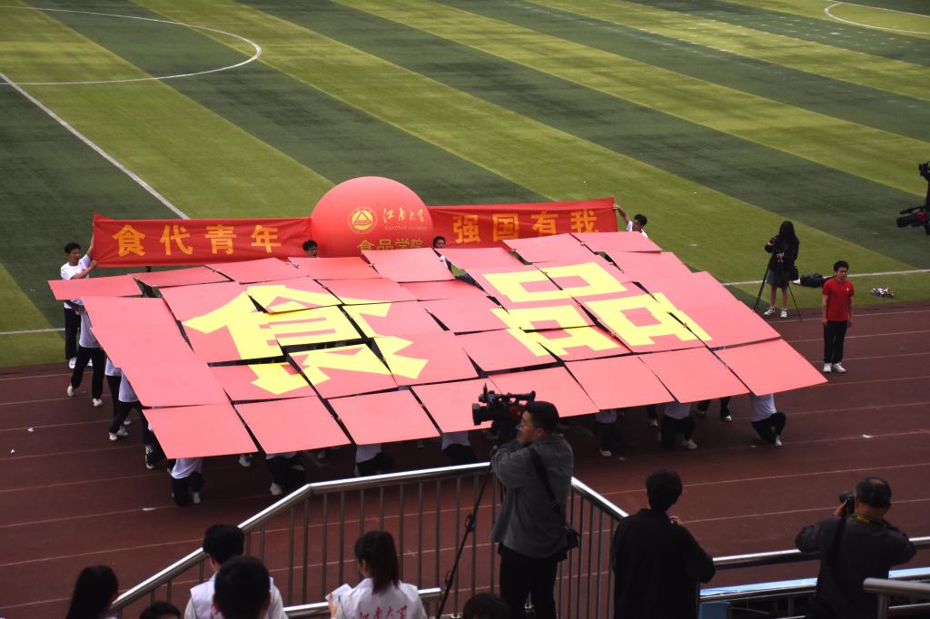 本届运动会开幕式继承往年传统,采用入场仪式与团体展演相结合的形式。国旗、校旗、会徽方阵气宇轩昂、步履铿锵,诠释江南体育精神。365英国上市官网在线方阵由46名本科生和研究生共同组成,代表着全院3600名师生员工。他们进的了实验室搞科研,战的了田径场争金牌!紧随方阵的巨型红球,寓意“红日初升,其道大光”,每一位学子背后都是365英国上市官网在线争先创优、光芒万丈的精神依靠。江南食品人,敢为天下先。“食”代学子将赓续使命,续写华章!