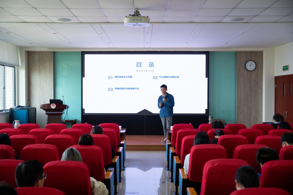 马克思主义学院青年教师张吴奇讲授题为《论“中国式现代化”的时代意义》的党课。他从百年未有之大变局、什么是西方式现代化、中国式现代化意味着什么等三个方面论述了“中国式现代化”的时代意义,强调其蕴含的独特世界观、价值观、历史观、文明观、民主观、生态观。