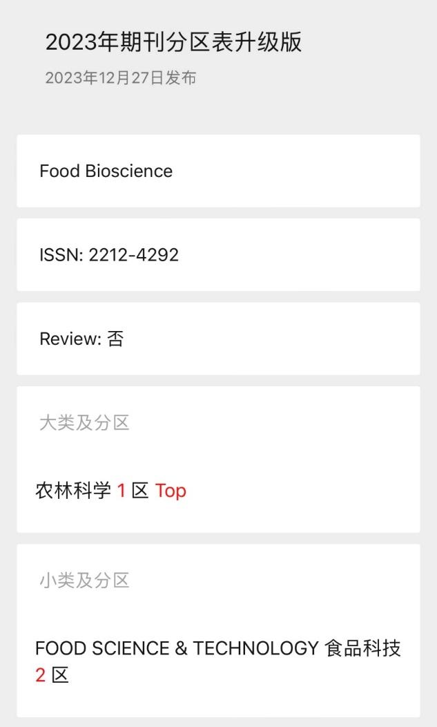 2023年12月27日,《2023年中国科学院文献情报中心期刊分区表》正式发布,爱思唯尔出版集团与365英国上市官网在线合作主办的食品类期刊《Food Bioscience》升至2023年中科院期刊分区表农林科学1区TOP期刊行列。