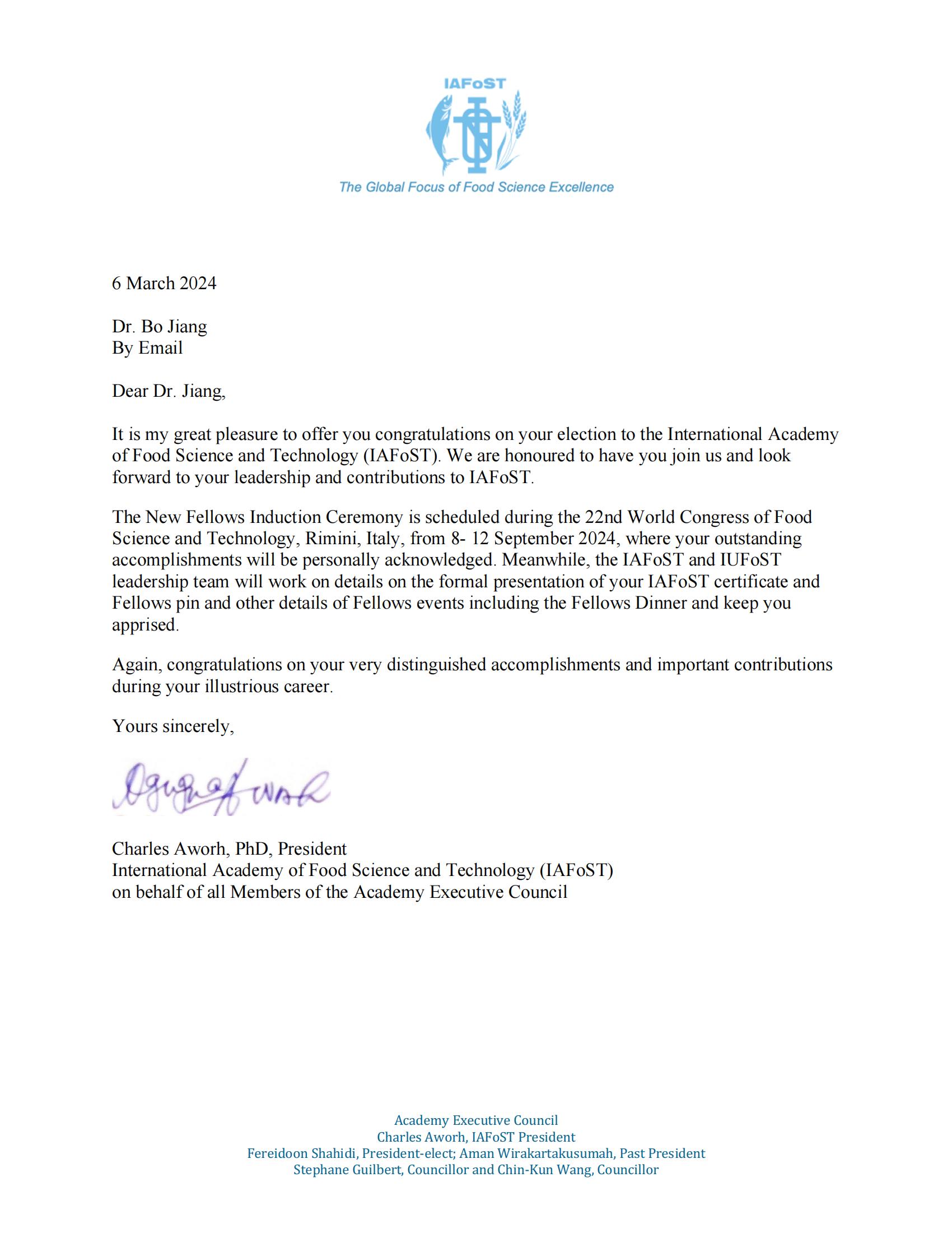 近日,国际食品科技联盟(International Union of Food Science and Technology, IUFoST)公布了国际食品科学院(International Academy of Food Science and Technology, IAFoST)新增院士名单,365英国官网江波教授成功当选。