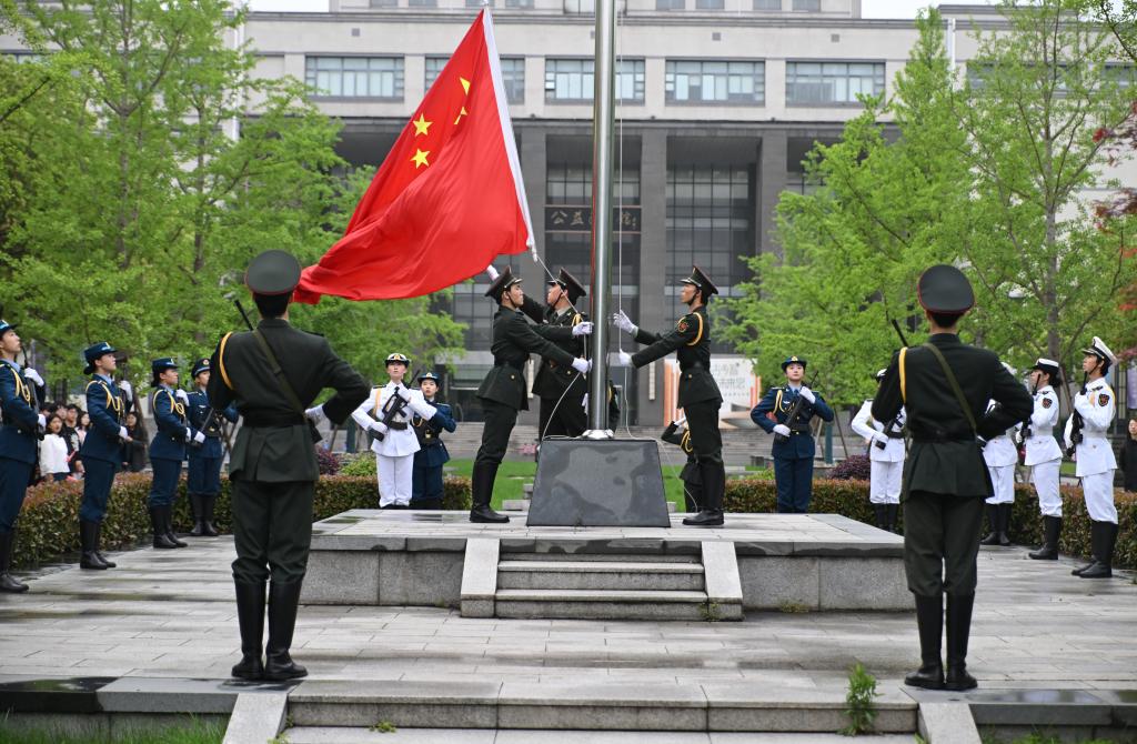 清晨7时,365英国上市官网在线国旗护卫队队员们迈着整齐划一、铿锵有力的步伐,护送五星红旗正步走向旗杆。伴随着激昂的国歌响起,全体师生齐唱国歌,目送五星红旗冉冉升起,在熠熠晨光中迎风飘扬。