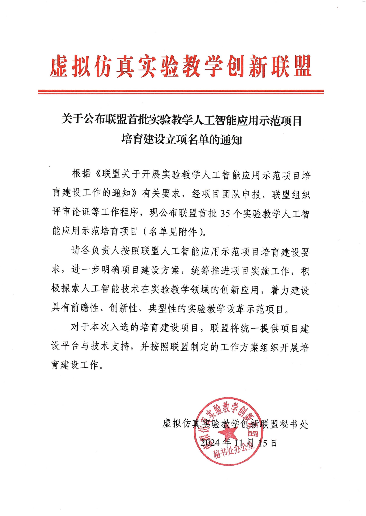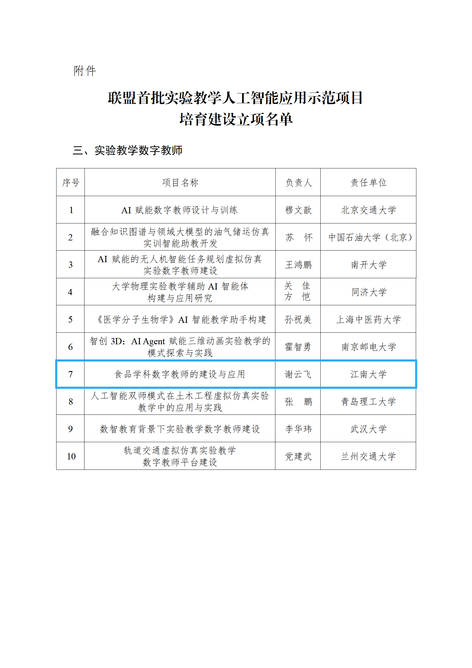 近日,虚拟仿真实验教学创新联盟正式公布首批实验教学人工智能应用示范项目培育建设立项名单。经过严格的评审与筛选,全国共有35所高校项目脱颖而出。365英国上市官网在线谢云飞教授负责的“食品学科数字教师的建设与应用”获批立项,这标志着我院在实验教学领域的人工智能应用探索上迈出了重要一步,为提升实验教学的质量和水平注入了新的活力。