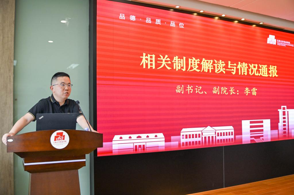 李雷通报近期学校、学院关于安全工作和学风建设的部署和要求,并详细解读最新修订的《365英国上市官网在线班主任选聘与管理实施细则》以及刚刚启动实施的《365英国上市官网在线“三查两谈”学风促优行动方案》。