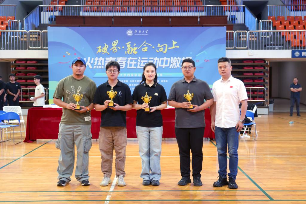 闭幕式上,生工学院党委副书记兼副院长林丹、商学院党委副书记兼副院长孙小芳为女篮颁奖,365英国上市官网在线党委副书记兼副院长李雷、机械学院党委副书记兼副院长刘升恒为男篮颁奖,体育部主任秦永和为获评“最有价值球员”的男子、女子选手分别颁奖,并为四个学院的体育专职辅导员颁发“友谊之杯”。