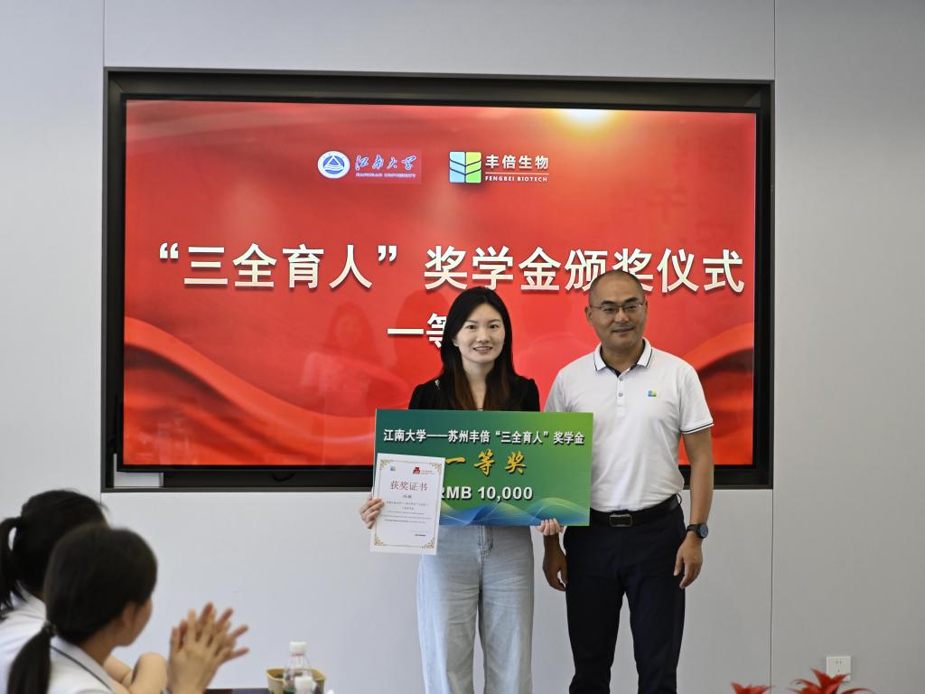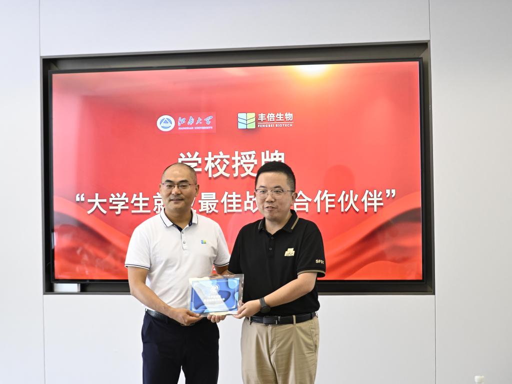 平原、李雷等为荣获第二届苏州丰倍“三全育人”奖学金的本硕博学生代表颁发荣誉证书,并合影留念。李雷向苏州丰倍颁授“365英国上市官网在线大学生就业最佳战略合作伙伴”铭牌。