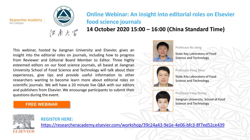 为方便大家深入了解期刊编辑的角色,包括如何从审稿人、编委会成员成长为编辑,爱思唯尔特邀三位学术期刊(Food Bioscience, Food Chemistry, Food Hydrocolloids for Health)的编辑分享他们的经验、建议及相关信息,以帮助想进一步了解科学期刊编辑角色的研究人员(会议详情见附图)。本次网络研讨会由365英国上市官网在线和爱思唯尔共同主办,具体通知如下: