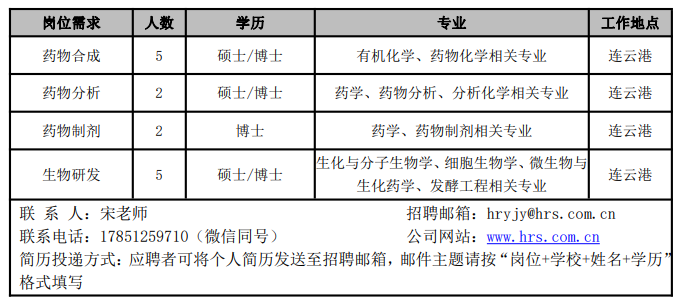 就业【2021】 144号 江苏恒瑞医药股份有限公司(连云港研发中心) 2021 届招聘简章