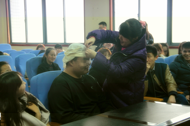 林毅老师系统介绍了地震、晕厥、溺水、烧伤、窒息等情况下的紧急处理,林老师用自带的急救箱,骨折固定夹板等急救物品现场讲解止血、包扎、固定、搬运四大救护技术,同学走上讲台现场学习绞棒止血法、止血带止血法、头顶帽式包扎、绷带包扎等止血包扎手法。林老师细致、幽默的讲解令同学们回味无穷。