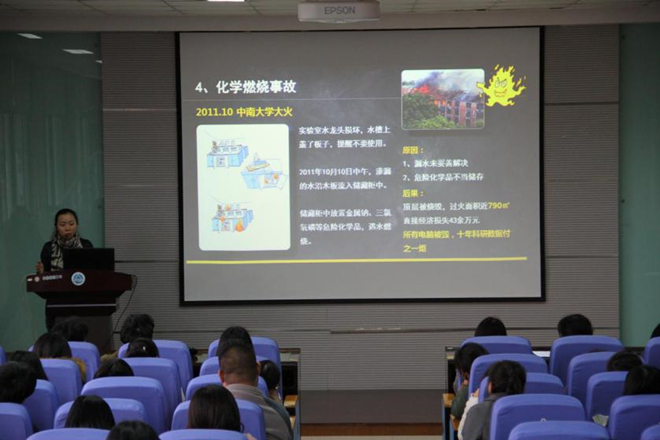 引入经典案例后,郑磊讲师分析了产生此类事故的具体原因,原因大体分可分为物理、化学、生物、人为、环境等五大类。其中重点讲述了化学因素和生物因素的案例。郑磊老师详细地讲述了一个由于工作人员的疏忽错接化学实验所用气体一氧化碳的气体管道所引发的惨案,再次强调了实验操作需谨慎,实验过程不得大意的主题。生物因素则更是无所见无所及,由东北林业大学一位教师引起的师生集体感染某病毒的事件令人震惊。