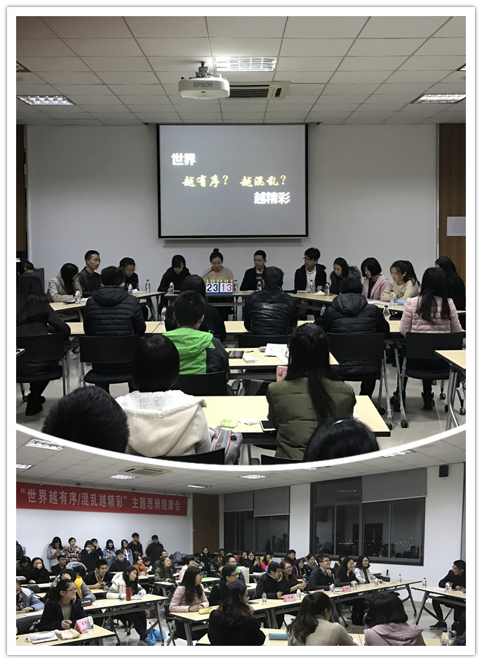 比赛刚一开始,双方辩手针锋相对,唇枪舌剑,你来我往,却又不失风度,侃侃而谈。在经过了三轮一对一辩论以及两次精彩的奇袭拉票之后,场上比分由最初的23:13变为31:5。接下来的双方队长总结陈词更是将比赛气氛推向了高潮。正方队长在完善己方观点的同时,又指出对手思维上的漏洞;反方队长从容不迫从反面论证,击破对手的观点。最后的观众投票结果为24:12,正方辩手以一票之差险胜反方辩手。最后,主持人邀请三位嘉宾谈了自己对于辩题的看法以及观赛感受。至此,本次思辨会圆满结束。