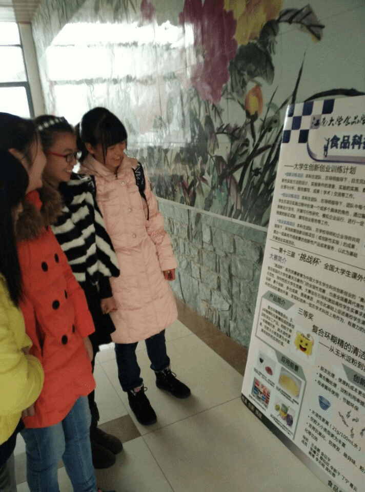 本次展示不仅包括盼盼食品杯创意大赛、“天野杯”学生食品创意大赛、“甘其食”传统食品创意大赛等各类大赛的优秀获奖作品,同时还对大学生创新创业训练计划中的优秀作品进行了展示。此外,还着重介绍了本次“挑战杯”全国大学生课外学术科技作品竞赛三等奖作品——复合环糊精。内容丰富多样,生动有趣。