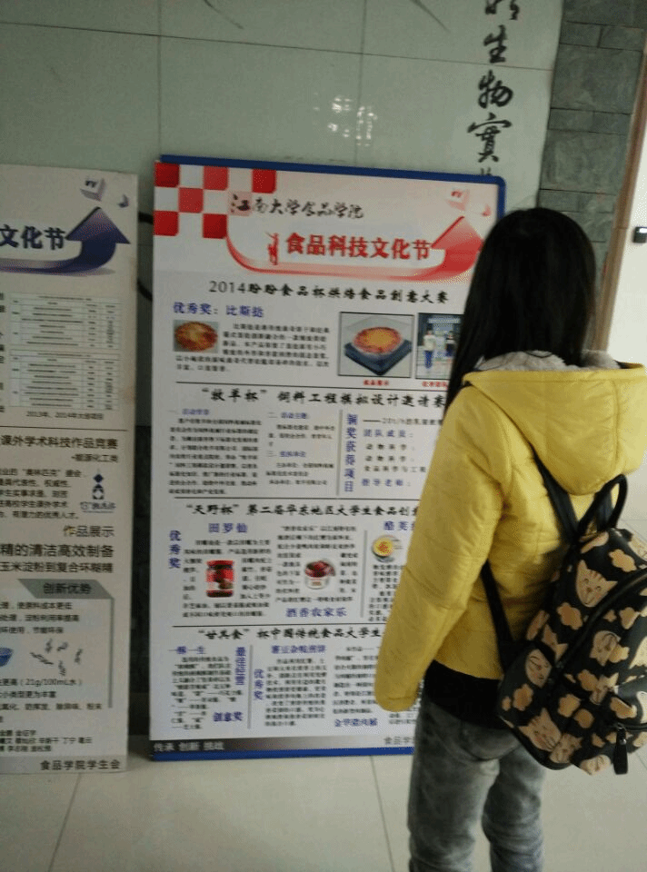 展板内容同时包括学院分科协中四大俱乐部的历史、特色、相关的特色活动与作品,介绍了本学期以来各大俱乐部举办的各项DIY活动,例如,烘焙俱乐部举办的面包创意大赛,烘焙周,DIY曲奇活动;乳制品俱乐部的作品牛奶小方、肉制品俱乐部的作品肉干、调味品俱乐部的作品蜂蜜柚子茶等等。