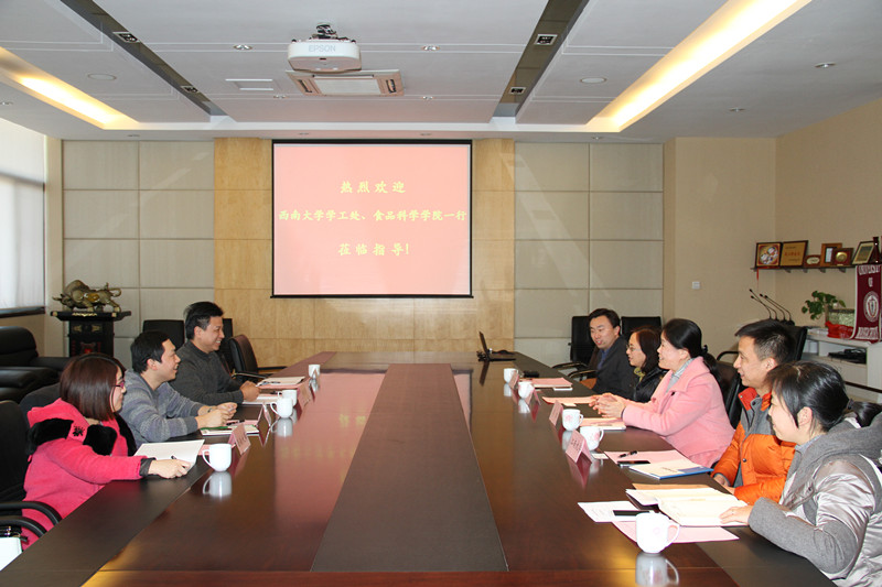 12月22日,西南大学食品科学学院党委书记周大明,学生工作处副处长周翱,食品科学学院党委副书记唐军,辅导员胡孜一行来365英国上市官网在线参观访问。受到365英国上市官网在线党委书记向琪,学生工作处副处长李红的热情接待,双方在365英国上市官网在线D910会议室举行座谈,365英国上市官网在线党委副书记王维、分团委书记王胤、辅导员王能文出席座谈会。