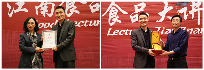 向琪为覃先生颁发双创导师聘书,张文赠送江南食品大讲堂演讲纪念杯。