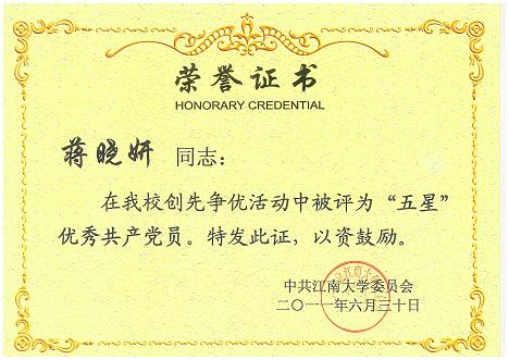 以上是蒋晓妍同学的真实情况。是一名合格的党员,品德兼优,更是个全面发展的优秀学生,相信她会在以后的学习和工作中取得更加优异的成绩。也相信她符合“五星优秀党员”的光荣称号。