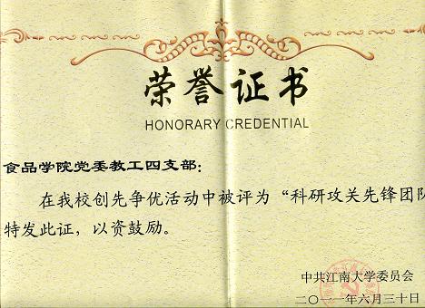 本支部各成员都能够较好的完成上级交办的各项任务。在本职工作中以科学发展观为指导,高标准、严要求,全体成员爱岗敬业、乐于奉献,始终将提高教学质量、科研创新水平作为我们开展工作的落脚点,并取得了可喜的成绩。近三年来,支部成员先后主持和承担国家“863”、国家科技支撑计划等国家、部省级项目12项,企业横向12项,科研到账经费750余万元,获国家科技进步二等奖1项、中国商业联合会特等奖等部省级奖励7项,发表学术论文80余篇,其中SCI、EI收入20余篇,出版教材、专著1部,授权专利10项,培养研究生30余人,入选教育部新世纪优秀人才计划1人。