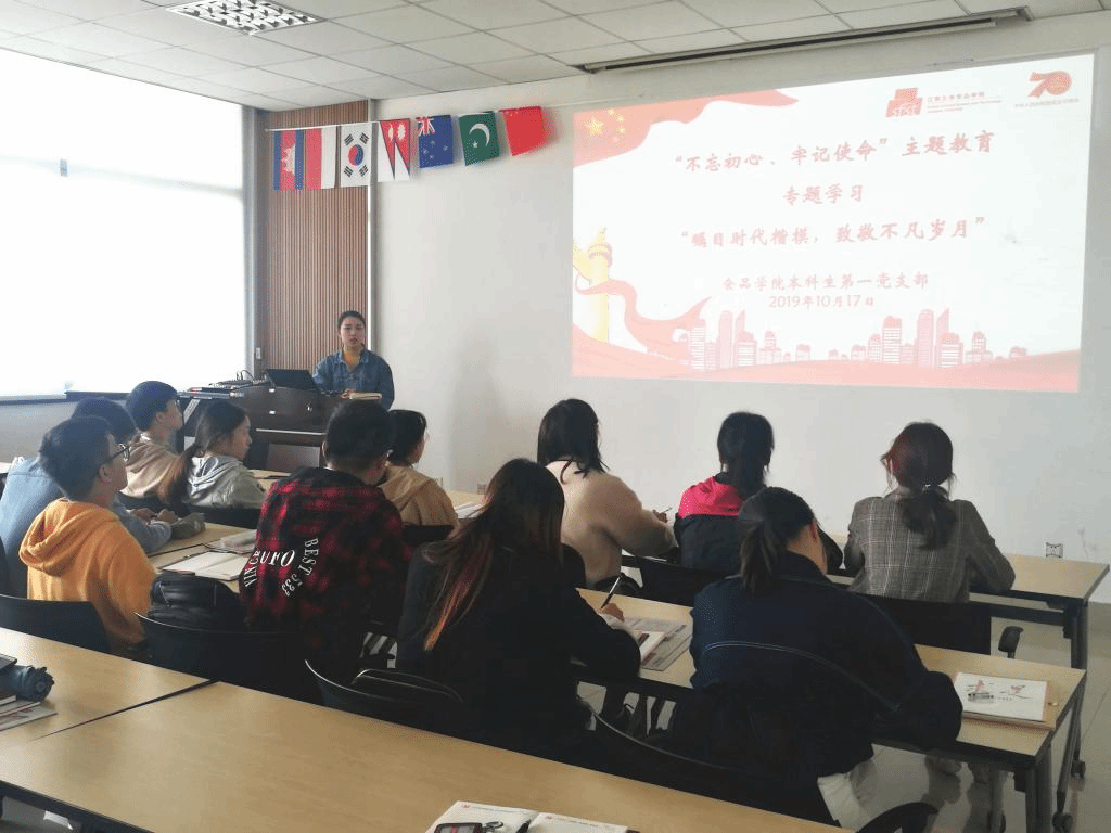 为响应上级党组织关于“不忘初心、牢记使命”主题教育的统一部署安排,强化基层党支部师生党员党性修养,10月17日中午,365英国上市官网在线本科生第一党支部在学院D917举行“瞩目时代楷模,致敬不凡岁月”专题党课。党课由支部书记胡晓丹主讲,支部全体党员参加。