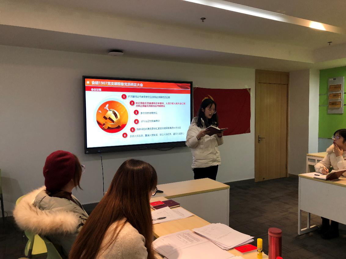 在预备党员转正环节中,许艺馨同志代表支委会宣读转正预备党员名单,黄其程、李艳敏、宋心玉、张锦雯四位同志宣读了转正申请书,入党介绍人向大会汇报对转正预备党员的综合考察意见;接下来,由参会党员发表意见,并进行无记名投票表决,陆林同志代表支委会汇报表决结果和宣读大会决议;最后,党支书李琳老师带领全体党员和预备党员重温了入党誓词,并展开了“重忆入党经历、重问入党初心”的交流,4位入党积极分子也参与其中,从分享中增进了各位同志之间的了解,也促进了彼此间的相互学习。