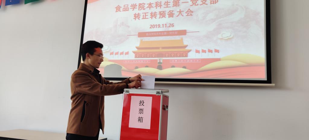 全体党员首先奏唱国歌,随后开展预备党员转正程序,宣传委员杨光宝同志代表支委会宣读了拟转正的预备党员名单,随后拟转正的预备党员依次陈述转正申请,入党介绍人汇报综合考察意见,在正式党员进行无记名投票表决后,支部书记胡晓丹同志代表支委会宣读表决结果并宣读大会决议。