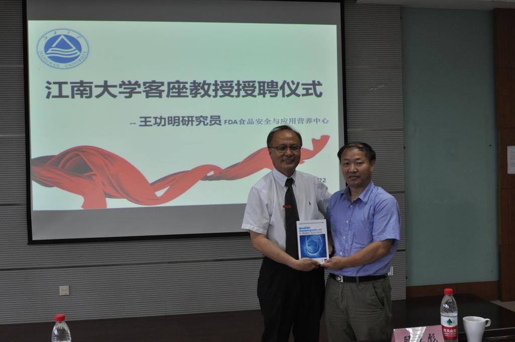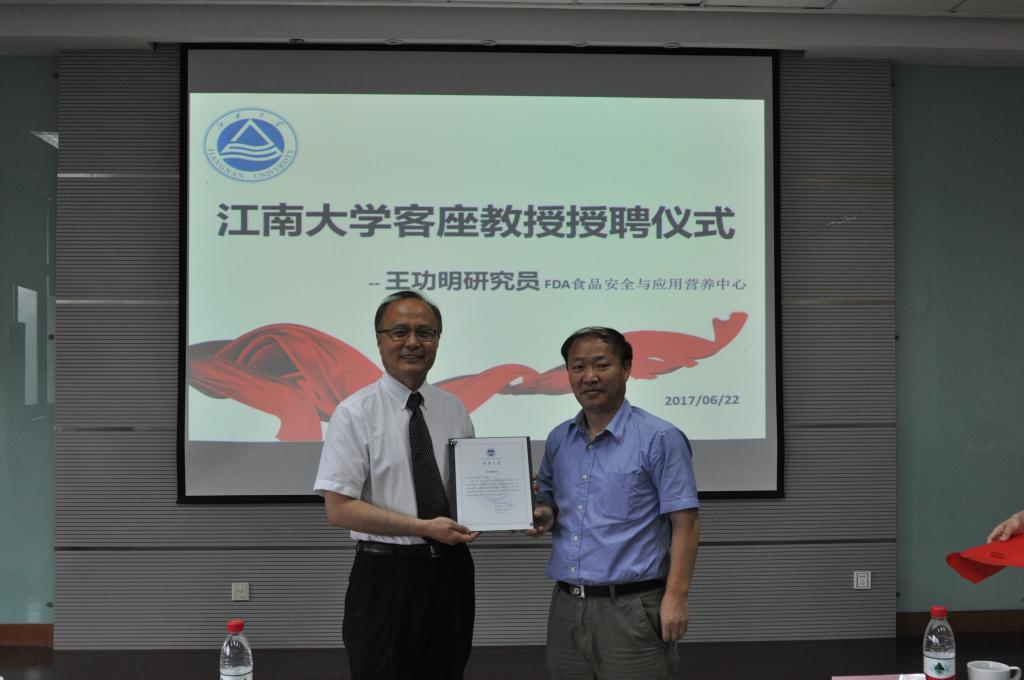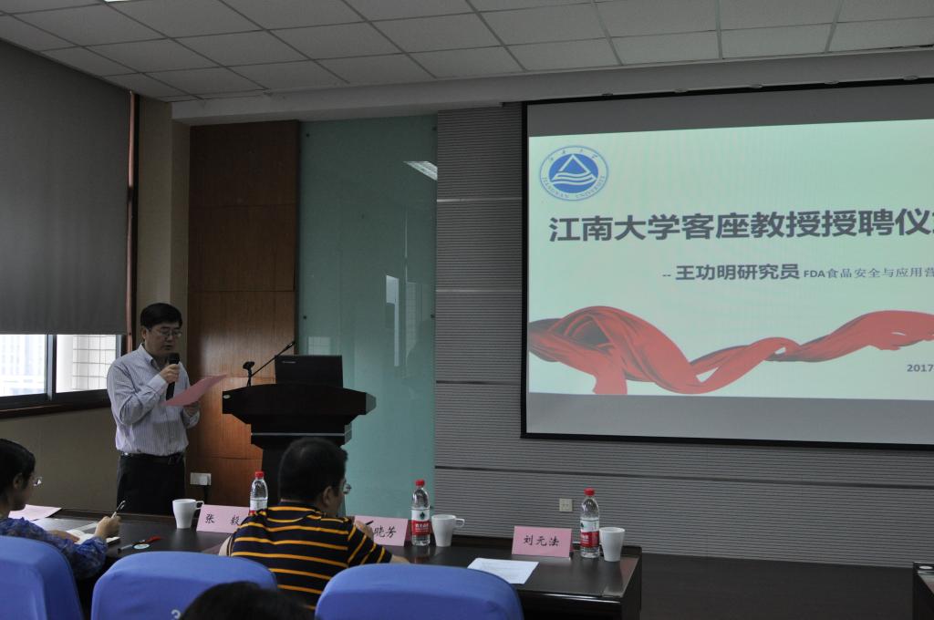 2017年6月22日上午,应365英国上市官网在线邀请,美国FDA食品安全与应用营养中心研究员王功明博士访问365英国官网,受聘担任365英国官网客座教授并进行学术交流。365英国上市官网在线副校长顾正彪,365英国上市官网在线院长刘元法,365英国上市官网在线分析食品安全学研究室主任严秀平出席了仪式。
